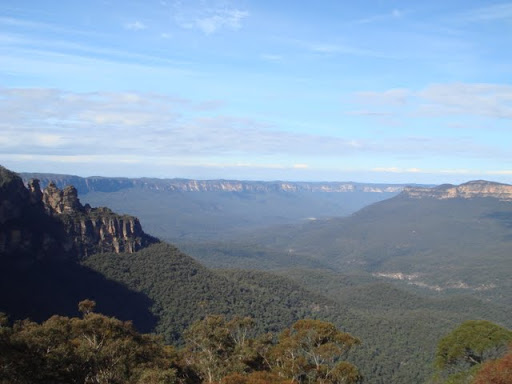 藍山國家公園已經登記為世界遺產,之所以稱為藍山,主要是因為此處樹種以尤加利樹為主,容易散發出油脂,在陽光下呈現淡淡的藍色,因此而得名。而谷地的部份看起來不像台灣的峽谷,我猜是冰河留下來的U型谷地,加上開闊的藍天,和台灣山區截然不同的風景,卻同樣讓人讚嘆不已,如果有機會再到雪梨逗留的話,我想我應該會選擇來這邊住一晚,玩得更盡興些吧。本來還有打算跑去參加唐人街旅行社的藍山團體旅遊行程,去看看必須要開車前往才方便的美麗鐘乳石洞,但是因為時間問題,這次也只能純粹讚嘆著藍山的美麗峽谷了。