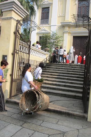 結果走到了教堂前面,看到長長的遊行隊伍,一堆人手拿蘇鐵葉跟著應該是神父之類在教堂前面整隊,很意外的碰上了望彌撒,從來沒見過望彌撒,覺得非常神奇,不過後來回家查資料,才發現天主教其實不是每次望彌撒都這麼搞工的,我們剛好碰上了四旬期的聖枝主日,才會每人手上都拿著蘇鐵葉。