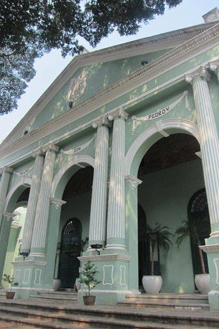 雖然這區很多教堂,但是也不難看到中國傳統民間信仰,沿著小斜坡走到了崗頂劇院前面,淡綠色的建築真的蠻漂亮的,隔著一條小路,對面就是聖奧斯定教堂,前面擠了滿滿的東南亞面孔,看來也是等著來參加彌撒的,不過時間好像比較晚開始,我們都繞了週邊一圈回來後,才看到他們在發蘇鐵葉。